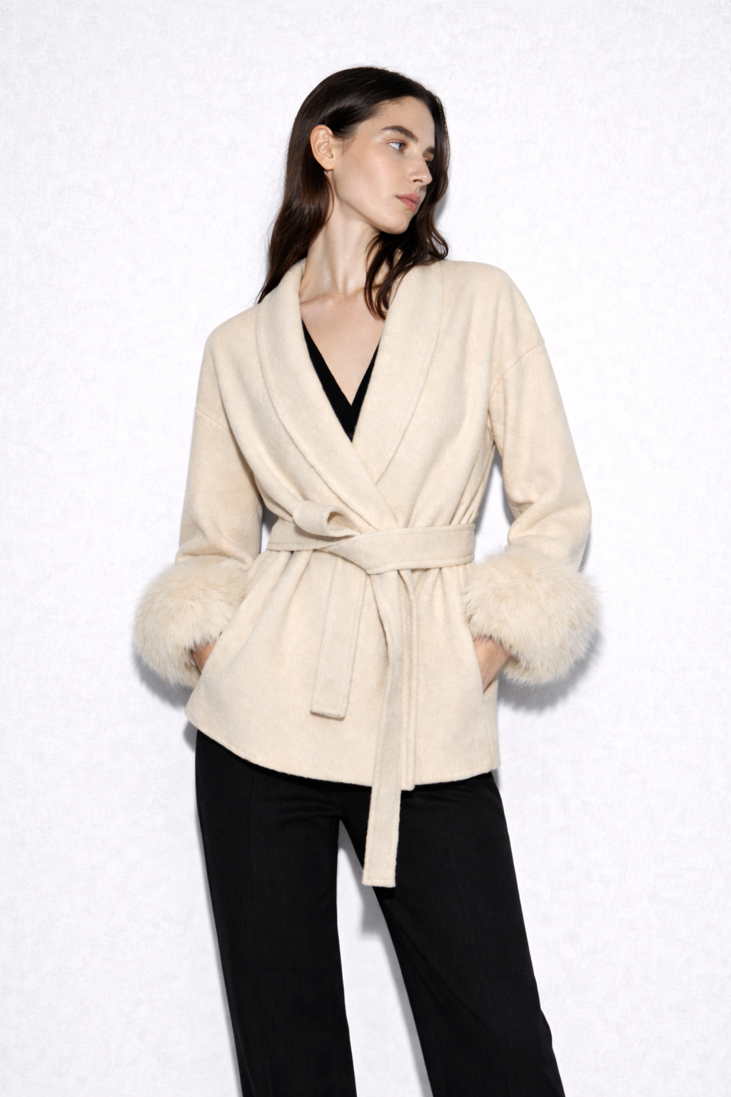 Effortlessly versatile — wear it your way. Style with or without the luxurious fur cuffs and belt to create three luxury looks that suit any mood or occasion.