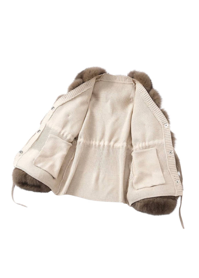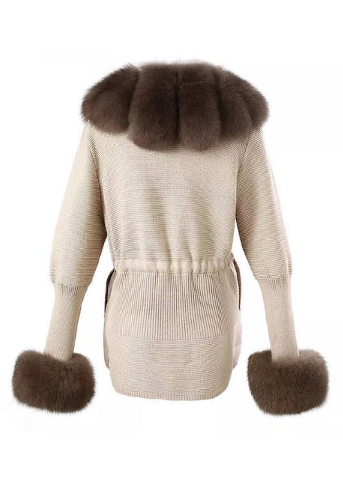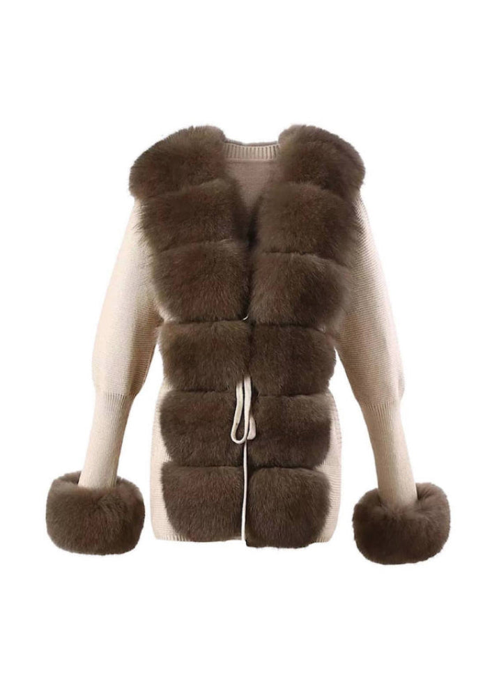 Brown Detachable Fox Fur Trim Beige Rib Knit Sweater